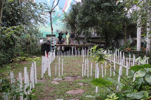 "Có 2 không gian trình diễn. Đó là "Đóng" trên nền sân gạch trước căn nhà sàn. Tôi sẽ vẽ hàng trăm người chồng chất trên mặt gạch. Ở giữa là khối hình trụ màu đỏ, 2 tầng, cao 4m. 7 nghệ sĩ sẽ trình diễn ra trong hình khối trụ đầy bí hiểm, công phá trong điều kiện không gian chật hẹp này.