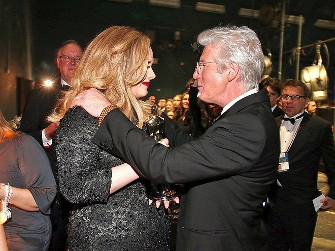 Adele nhận cái ôm hôn chúc mừng từ tài tử Richard Gere sau khi cô giành tượng vàng cho Ca khúc "Skyfall".