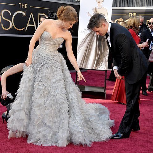 Vị hôn phu giúp người đẹp Amy Adams chỉnh lại dáng váy trên thảm đỏ.