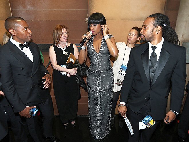 Jennifer Hudson kiểm tra lại thiết bị âm thanh trước khi ra sân khấu trình diễn "And I Am Telling You I'm Not Going" từ bộ phim nhạc kịch Dreamgirls cô đã giành Oscar năm 2006.