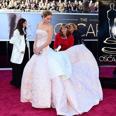 Để có được hình ảnh đẹp nhất trên thảm đỏ Jennifer Lawrence cần đến sự trợ giúp cho chiếc đầm của mình.