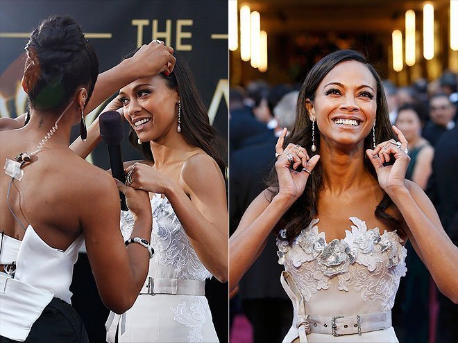 Kelly Rowland giúp Zoë Saldana, ngôi sao phim Avatar chỉnh lại tóc trước khi chụp hình.