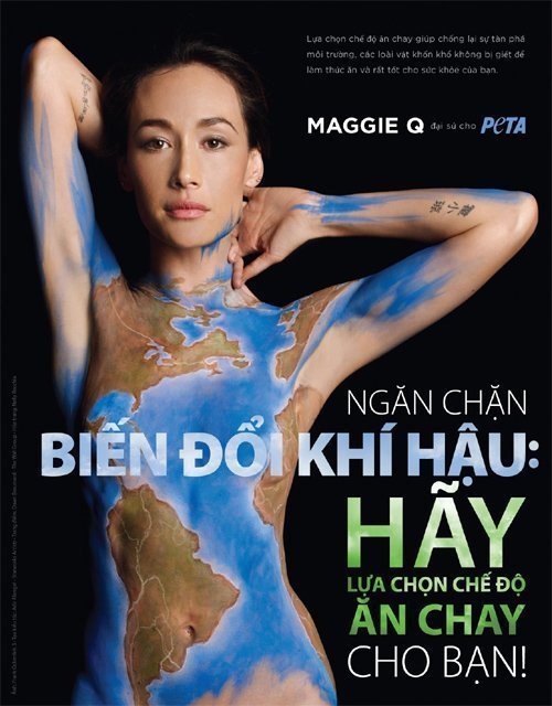 Maggie Q vừa tham gia vào một quảng cáo đầy góc cạnh mới của PETA, trong đó cô xuất hiện với toàn cơ thể được sơn vẽ như trái đất, bên cạnh là dòng chữ “Đấu tranh chống thay đổi khí hậu bằng cách thay đổi cách ăn uống. Hãy ăn chay!”.