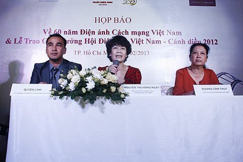 Đại diện ban tổ chức Cánh diều 2013, từ trái qua: MC Quyền Linh, nhà biên kịch Nguyễn Thị Hồng Ngát và nhà biên kịch Dương Cẩm Thúy. Ảnh: Duy Linh