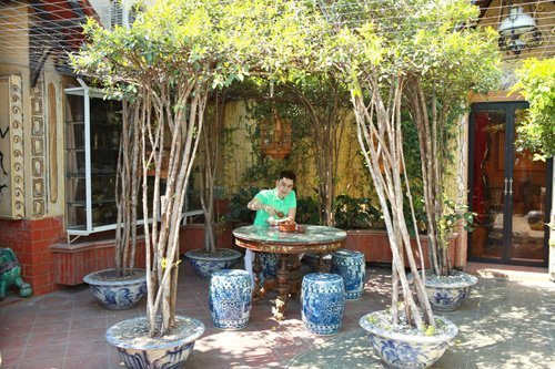 Cái mái đình nhỏ được làm bằng cây kiểng khá lạ mắt, nhìn vào không ai nghĩ nhà anh nằm ở quận 1, ngay trung tâm Sài Gòn.