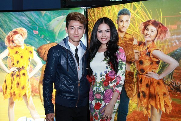 Vân Trang và Isacc trong buổi công chiếu "Gia đình Crood" phiên bản tiếng Việt.