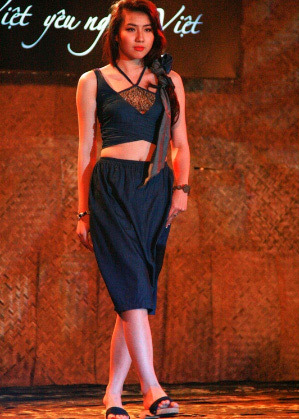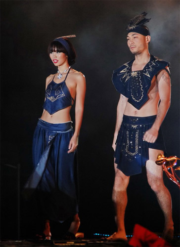 | Trong khi Hà Anh đi guốc mộc diện áo yếm làm từ jean thì Doãn Tuấn lại chân trần váy khố lãng tử và nam tính. |