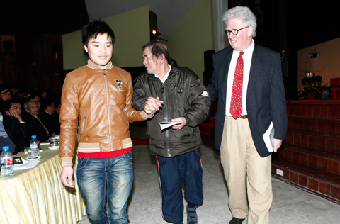 | Kevin và nhà văn Lê Lựu - 2 người lính đã từng ở hai bên chiến tuyến ngày hôm nay ở đây dìu nhau khi một người sức khỏe đã không còn được như trước. Ảnh : Lê Thiết Cương |