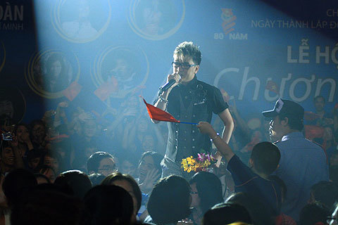 Có vẻ như, việc tham gia một show diễn phục vụ sinh viên đã khiến cho Mr.Đàm trẻ ra cả chục tuổi. Diện một bộ trang phục tương đối “xì tin”, anh liên tục khuấy động khán phòng bằng một phong cách sôi động, gần gũi. Dù xuất hiện vào cuối đêm nhạc, nhưng anh chính là người nhận được nhiều sự cổ vũ nhất từ phía khán giả.