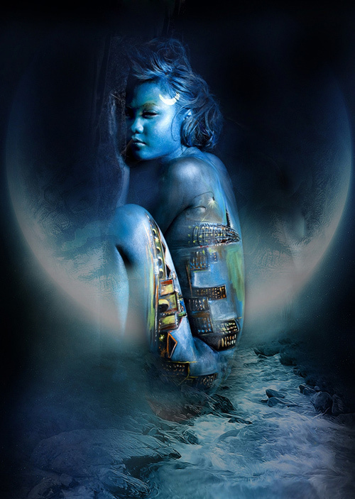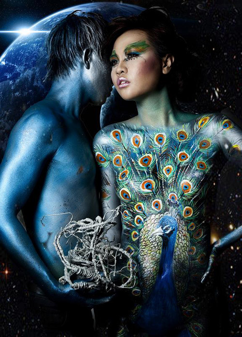 Thứ nghệ thuật mà Đàm Thu Trang lựa chọn để phủ lên thân thể - body art - là sự kết hợp hài hòa giữa nghệ thuật trang điểm và hóa trang, đang được ưa chuộng trên thế giới. Để có tấm ảnh chim công trên, Đàm Thu Trang đã phải quỳ hai tiếng đồng hồ để các họa sĩ vẽ lên cơ thể và đứng chụp từ 9h sáng đến 7h tối.