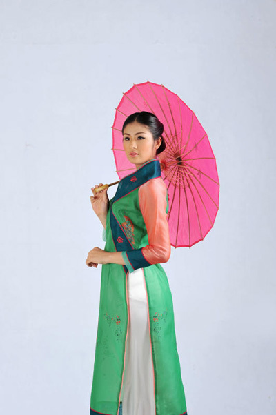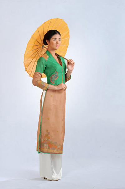 Từ sự ngưỡng mộ và kính trọng đức tính kiên cường, cũng như bản lĩnh "samurai" của con người Nhật Bản, tôi thực hiện bộ trang phục áo dài với kiểu dáng cách điệu từ chính những trang phục truyền thống của Nhật Bản với chiếc cổ áo rất "đặc trưng". Chiếc áo được may trên chất liệu vải có in họa tiết hoa anh đào Nhật Bản điểm xuyết, gam màu sử dụng là những tông màu tương phản mạnh - tượng trưng cho tinh thần mạnh mẽ vươn lên trong khốn khó của người dân Nhật Bản!