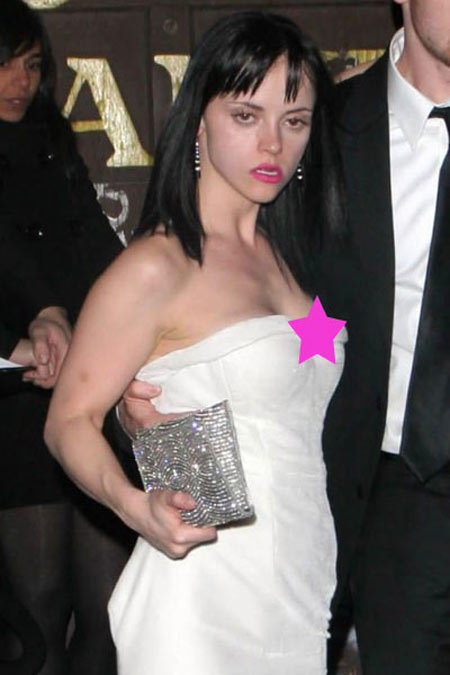 | Quá say rượu, Christina Ricci không còn kiểm soát nổi trang phục mặc trên người nên chiếc váy quây của cô tụt xuống lúc nào không hay. |