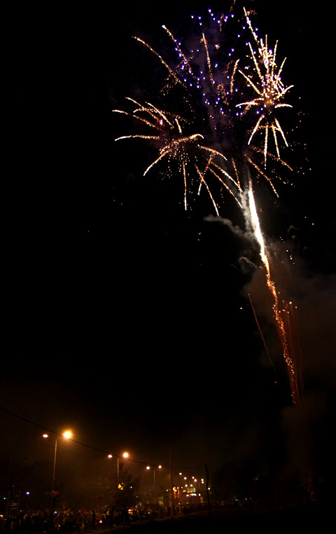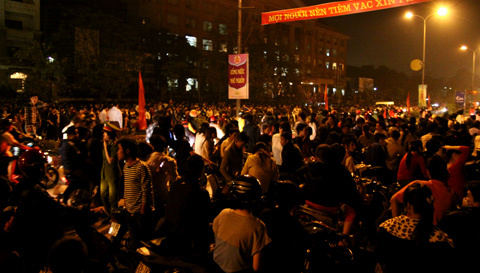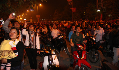 21h kém 5 phút, con đường sát với trận địa bắn pháo hoa (tầm thấp) đã chật kín người và xe cộ. Tuy đông đúc, nhưng không hề có cảnh chen lấn xô bồ. Người dân đến xem pháo hoa trong niềm vui phấn khởi. |