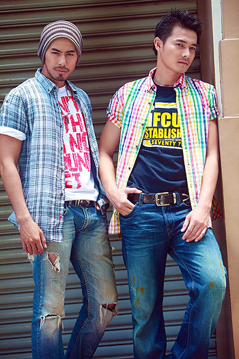 Cả hai anh chàng đều diện trang phục trẻ trung, năng động và cá tính khi xuất hiện bên cạnh người đẹp.
