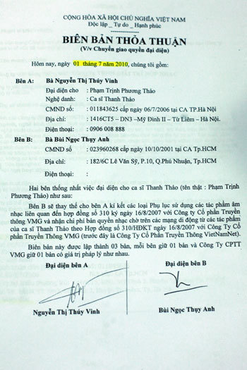 Theo như giấy tờ gửi kèm văn bản thì người đại diện hiện tại cho Thanh Thảo là Thục Anh, một ca sĩ thuộc Music Box.