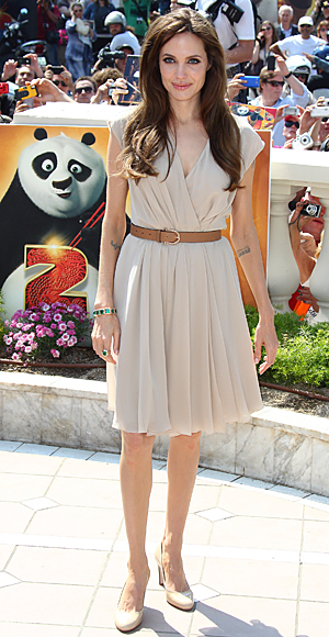 Cuối cùng, sau bao chờ đợi, Angelina Jolie đã có mặt tại Cannes ngày 12/5 để quảng bá cho bộ phim hoạt hình Kung Fu Panda 2 do cô lồng tiếng. Angie chọn toàn đồ hiệu Salvatore Ferragamo khi xuất hiện trước báo giới và người hâm mộ. Cô cực kỳ thanh lịch trong chiếc đầm màu be bằng chất liệu chiffon.