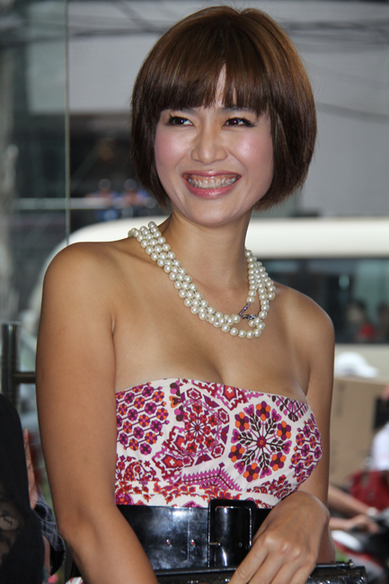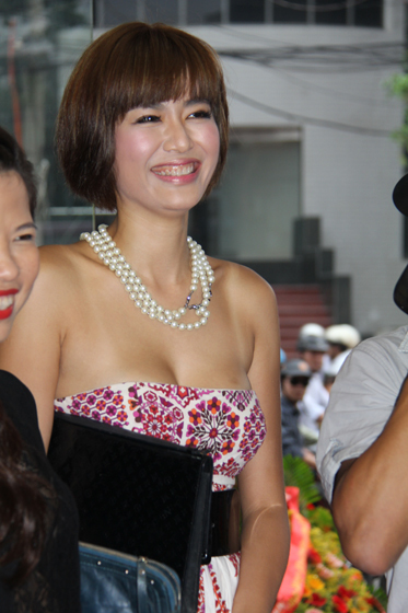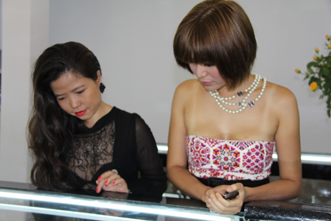 Nhà thiết kế Hà Linh Thư đi dự tiệc cùng Thu Thủy và chị cũng khá tự tin khi diện một chiếc áo ren đen mỏng khoe khéo vòng 1. Cả hai tỏ ra thích thú khi nhìn những viên kim cương nhân tạo, kim cương thật được trang trí nghệ thuật trên những chiếc điện thoại đắt tiền.