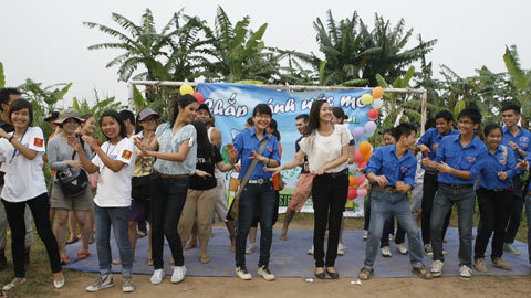 Ngọc Hân cùng các em nhỏ và sinh viên tình nguyện cùng nhẩy múa, ca hát ngoài xóm bãi sông Hồng