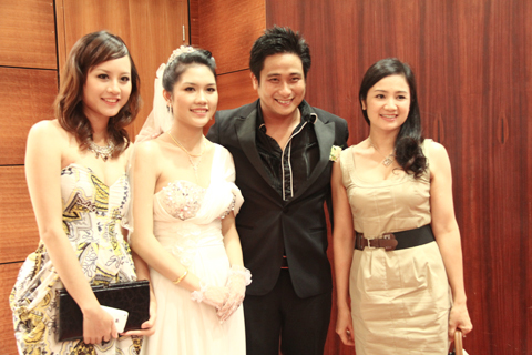 Huyền Trang (ngoài cùng bên trái) là bạn thân của cô dâu Thùy Dương còn diễn viên Thu Hà (ngoài cùng bên phải) là người đồng nghiệp của chú rể.