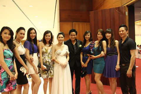 Các người đẹp chụp ảnh cùng cô dâu và chú rể