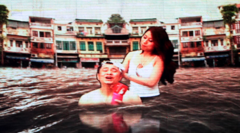 Tự Long trong một cảnh gội đầu mùa thành phố lụt