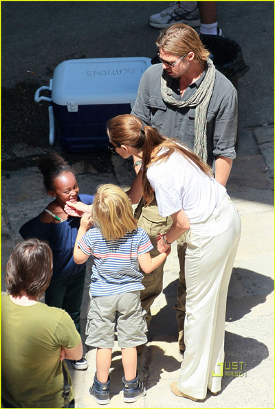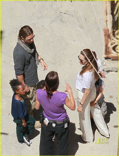Nhà Pitt-Jolie luôn có truyền thống kéo đến phim trường của các dự án Angelina Jolie và Brad Pitt đang thực hiện với tư cách diễn viên, nhà sản xuất hay đạo diễn ở bất cứ đâu trên thế giới. Lần này, cả nhà cùng đến Malta, nơi bố Brad đang đóng phim World War Z. Hôm 21/6, mẹ con Angelina Jolie đã bất ngờ đến phim trường thăm Brad Pitt.