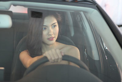 Nữ diễn viên xinh đẹp khoe vai trần gợi cảm trên ghế lái...