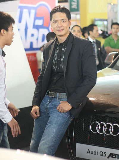 Siêu mẫu Bình Minh khá giản dị với quần jeans và áo vest đen bên chiếc Audi Q5 mà anh làm đại sứ.