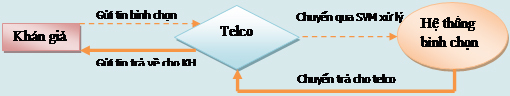 Khi khán giả bắt đầu nhắn tin bình chọn. Tin nhắn sẽ di chuyển từ Khán giả ---> đến Telco -----> Telco xử lý và tiếp tục chuyển cho Hệ thông bình chọn. Hệ thống nhận bình chọn, tính 1 bình chọn --> chuyển thông tin trả cho Telco ----> Telco chuyển lại cho khán giả xác nhận cảm ơn.