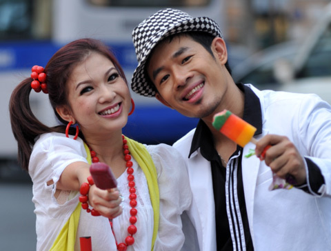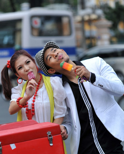 Bị "phát hiện", cả hai liền đưa que kem đang ăn dở ra... mời