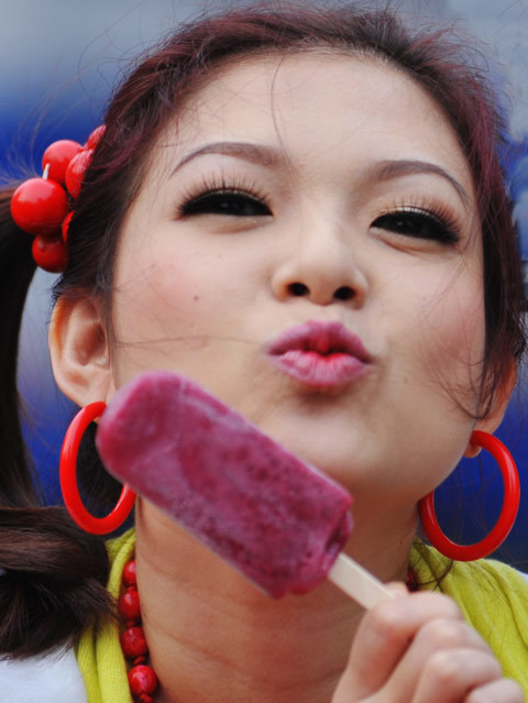 Trời nóng, nữ ca sĩ ăn cây kem ngon lành, hồn nhiên như một cô bé