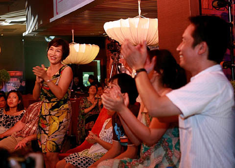 Gia đình Mỹ Linh - Anh Quân và các con cổ vũ nồng nhiệt trên hàng ghế đầu.