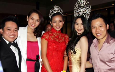 Ngọc Trinh và Khắc Tiệp chụp ảnh trong buổi tiệc sau khi đăng quang