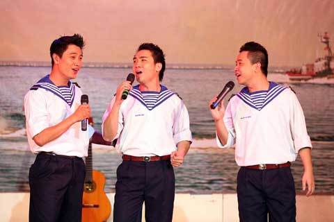 Phương My chụp hình lưu niệm với nhạc sĩ Nguyễn Hồng Sơn và tác giả thơ-đại tá Đoàn Vũ Vinh, chánh văn Phòng Quân chủng HQ