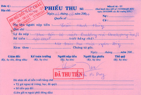 Phiếu thu tiền của trường Anh ngữ quốc tế Úc Châu khi bán sách lậu cho nhân viên First News