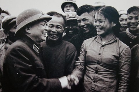 | Đại tướng khen ngợi nhân dân địa phương và anh chị em công nhân đội vận tải Sông Gianh, Quảng Bình đã góp phần tích cực vận chuyển hàng ra tiền tuyến (1968) |