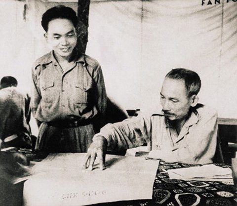 | Chủ tịch Hồ Chí Minh và Đại tướng Tổng tư lệnh Võ Nguyên Giáp tại Sở chỉ huy Chiến dịch Biên giới (1950). |