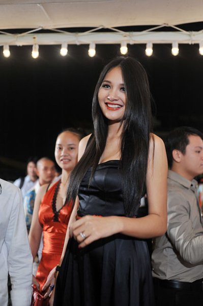| Hoa hậu Ngọc Hân tươi cười trước ống kính phóng viên |