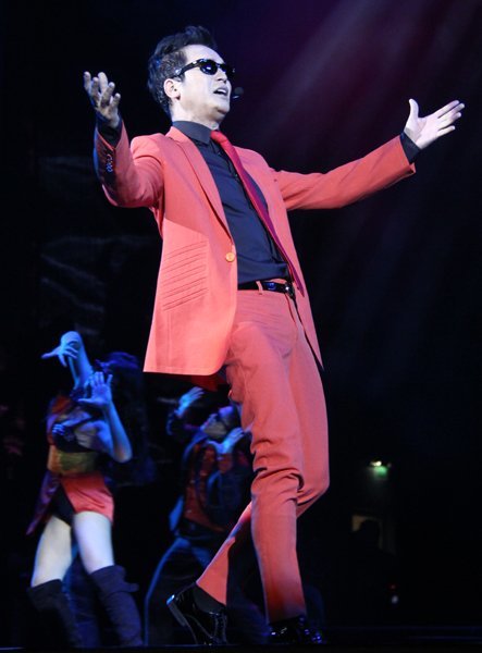 Nguyễn Hưng lịch lãm trong bộ vest màu đỏ trẻ trung và hòa cùng những tiết tấu sôi động.