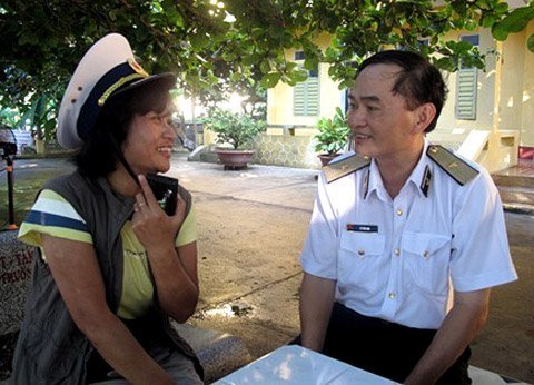 | Nhạc sĩ Quỳnh Hợp và Phó tư lệnh Quân chủng Hải quân Lê Văn Đạo trò chuyện dưới tán bàng vuông trên đảo Trường Sa lớn |