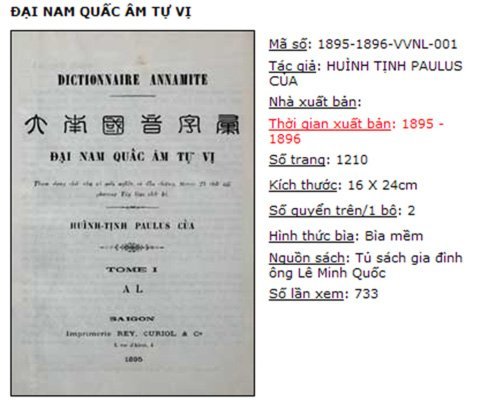 Đó là "Đại nam Quấc âm tự vị" do Huỳnh Tịnh Của (1834-1907) biên soạn gồm 2