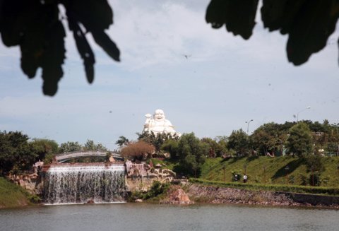 | Tượng phật Di Lặc trông xuống hồ nhân tạo trên đỉnh núi Lớn. Ảnh: Long Hà |