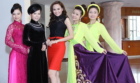 Diễm Hương chụp ảnh cùng một số thi sinh tham dự cuộc thi HH các dân tộc VN 2011.