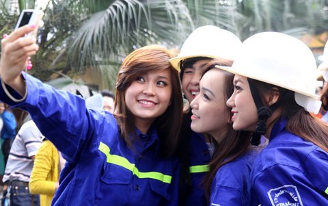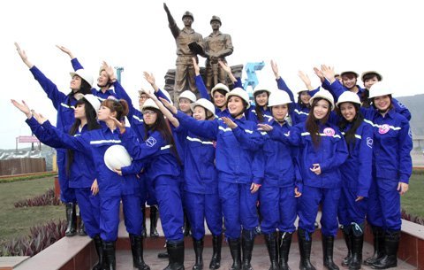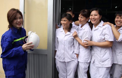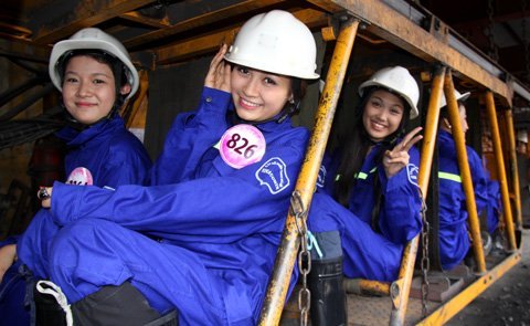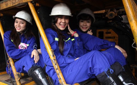 Những chị công nhân làm việc tại khu mỏ cũng tỏ thích thú và bất ngờ trước vẻ đẹp của các thí sinh.
