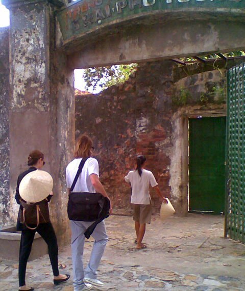 | Jolie mang theo nón lá, trong khi Pitt đeo chiếc túi khá nặng, đi tham quan khu di tích nhà giam chuồng cọp Côn Đảo |