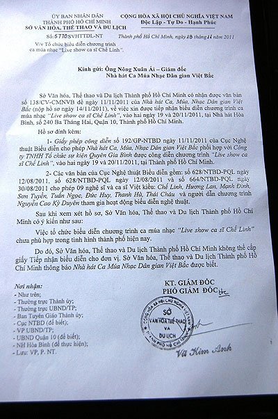 81/GTN-VHTT&DL ngày 11/11 chương trình liveshow ca sĩ Chế Linh. Theo