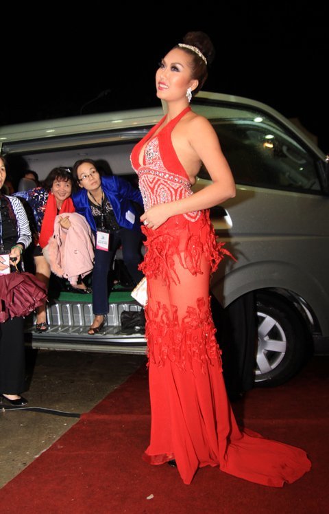 | Phi Thanh Vân chọn cho mình chiếc váy đỏ với vải trong suốt gợi cảm nhưng vẫn kín đáo. |