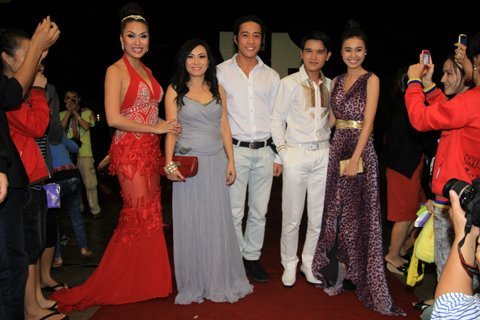| Phi Thanh Vân, Phương Thanh, Linh Sơn, Thanh Hòa, Ninh Dương Lan Ngọc cùng nhau chụp ảnh trên thảm đỏ và gây náo loạn tại cổng nhà hát. |