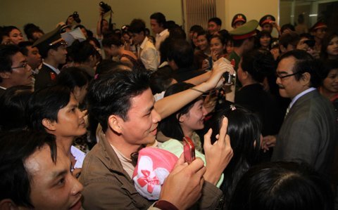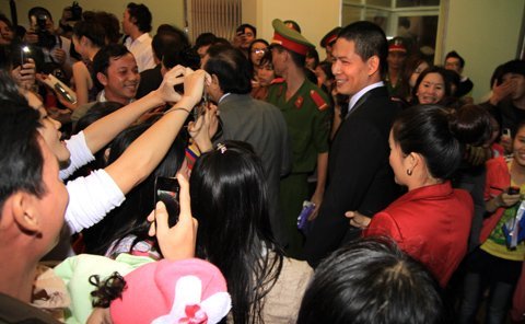 | Diễn viên Bình Minh cùng vợ đến dự đã ngay lập tức bị người hâm mộ vây quanh và xin chữ ký làm tắc cả lối ra vào nhà hát. |