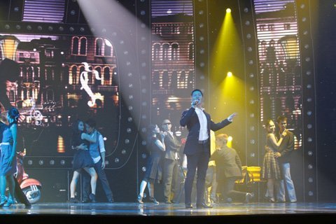 Đức Tuấn tự tin với phong cách Broadway bằng ca khúc "Any time any where". Anh hát toàn bộ bài hát bằng tiếng Ý. |